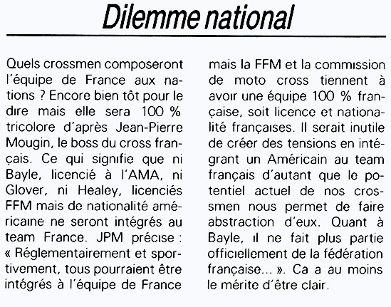 ".....qu'est ce que tu veux, ce n'est pas de ma faute si les autres sont à l'arrêt.. Enfin à l'arrêt, je plaisante. Mais personne ne m'a posé de problèmes, c'est également vrai - à part Johnson ! En fait, cela a été beaucoup plus facile que l'année dernière, car là, même si la Yougo s'était disputée, j'aurais été champion quand même. Alors bon, je suis évidemment content d'être titré, mais on peut dire que c'était facile. Maintenant, je vais aller faire le 500 US et là ça va pas être la même histoire. Pour 90, rien n'est encore décidé. American Honda doit me faire une proposition, enfin on verra bien".