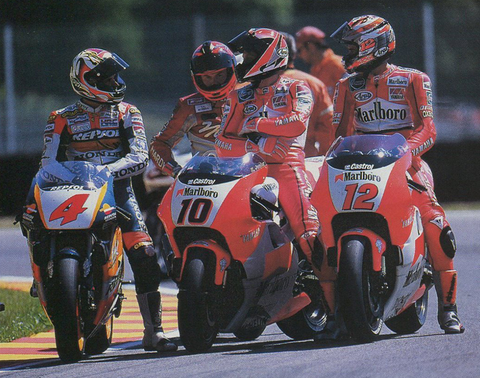 Et concernant la course : " J'ai remonté et doublé Itoh, Roberts, Okada et Russel... Lorsque j'ai eu Cadalora en point de mire, j'ai commencé à avoir des problèmes avec mon frein arrière."