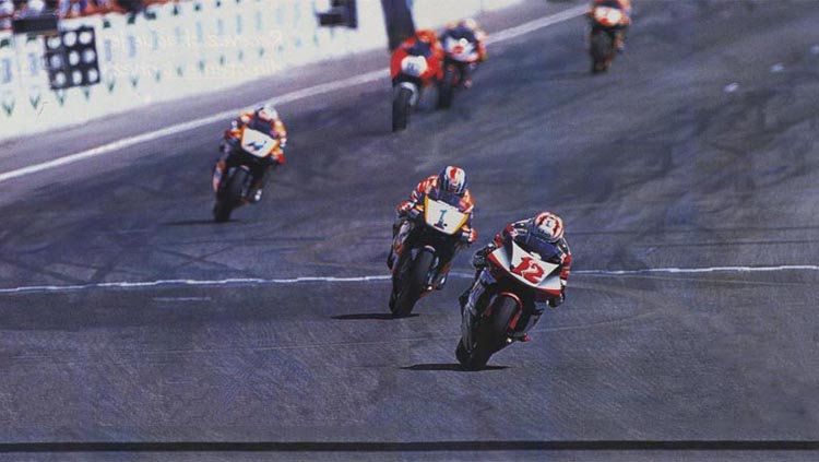 Max Biaggi s'est déjà envolé suivi de JMB (12), Mick Doohan (1), Alex Criville (4) et Barros (9). On voit également Régis Laconi (55)